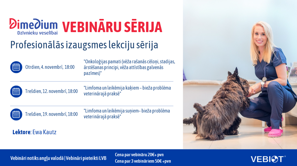 Aicinām piedalīties Dimedium vebināru ciklā veterinārmedicīnas speciālistiem, kas sniedz iespēju paplašināt zināšanas par dzīvnieku veselību, padziļināti iepazīt onkoloģijas, limfomas un leikēmijas tēmas, kā arī gūt praktiskus padomus un dalīties pieredzē ar kolēģiem.