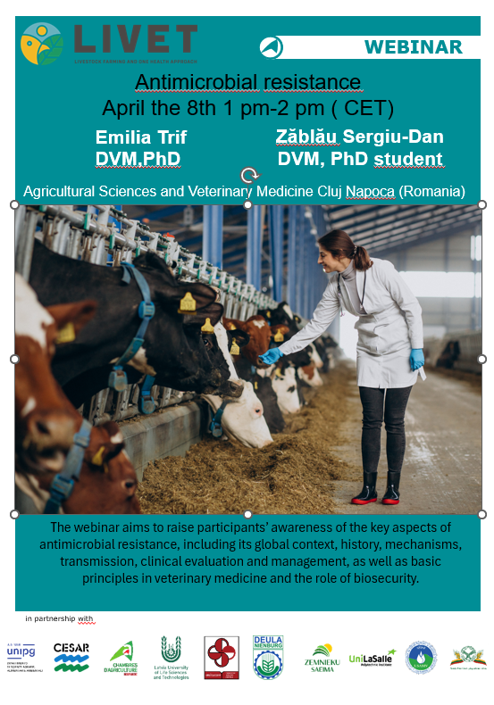 As part of the One Health Livet project, we are pleased to invite you to an upcoming webinar on antimicrobial resistance. This session will address key aspects including its global context, history, mechanisms, transmission, clinical evaluation and management, as well as fundamental principles in veterinary medicine and the role of biosecurity.