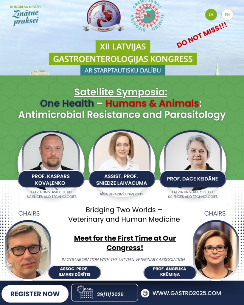 No plkst. 12:30 līdz 13:30 B hallē kongresa ietvaros norisināsies satelītsimpozijs “Viena Veselība – cilvēku un dzīvnieku veselība: antimikrobiālā rezistence un parazitoloģija”, apskatot vienas veselības perspektīvu: cilvēku un veterinārās parazitoloģijas mijiedarbību antimikrobiālās rezistences kontekstā.