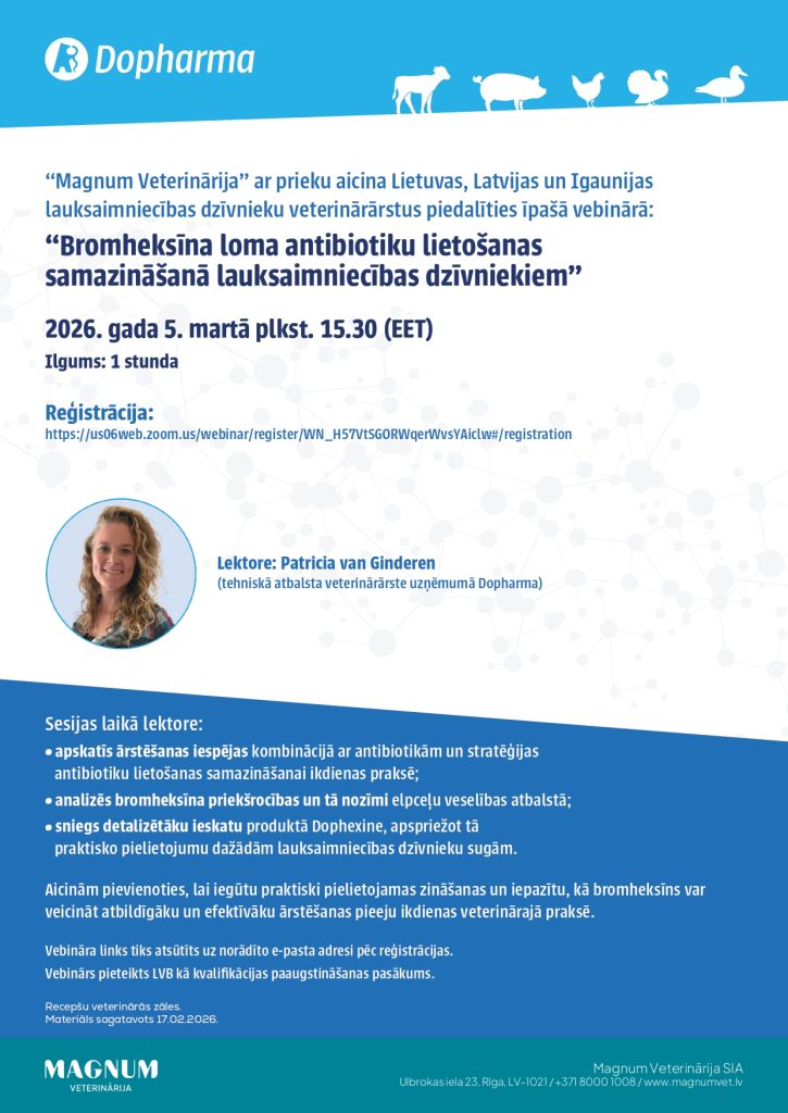 SIA “Magnum Veterinārija” aicina uz vebināru “Bromheksīna loma antibiotiku lietošanas samazināšanā lauksaimniecības dzīvniekiem”