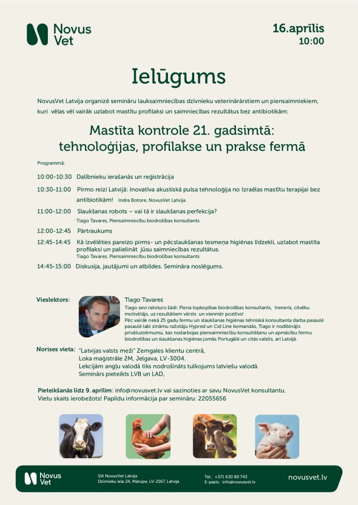 SIA “NovusVet Latvija” aicina uz semināru “Mastīta kontrole 21. gadsimtā: tehnoloģijas, profilakse un prakse fermā”
