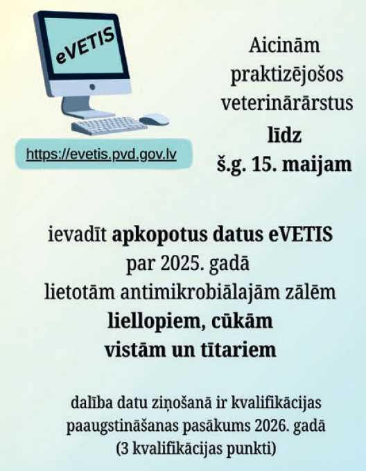 Informējam, ka 2025. gada 18. decembrī ir stājušies spēkā Ministru kabineta 2025. gada 16. decembra noteikumi Nr. 775 “Informācijas apkopošanas un statistikas veidošanas noteikumi veterināro zāļu aprites jomā”, kas nosaka veterinārārstu pienākumu datus par produktīvajiem lauksaimniecības dzīvniekiem lietotajām un/vai dzīvnieku īpašniekiem (turētājiem) izsniegtajām antimikrobiālajām zālēm ievadīt Veterinārās e-veselības informācijas sistēmas (eVETIS).